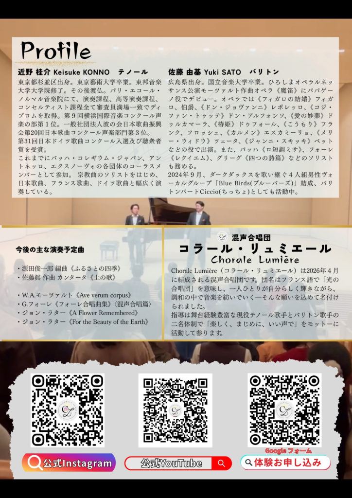 混声合唱団コラール・リュミエールは、4月からの本格始動へ向けて、2月、3月に体験会を開催いたします。 合唱が初めての方も、経験のある方も大歓迎です。まずはぜひ、気軽に体験会にご参加ください。